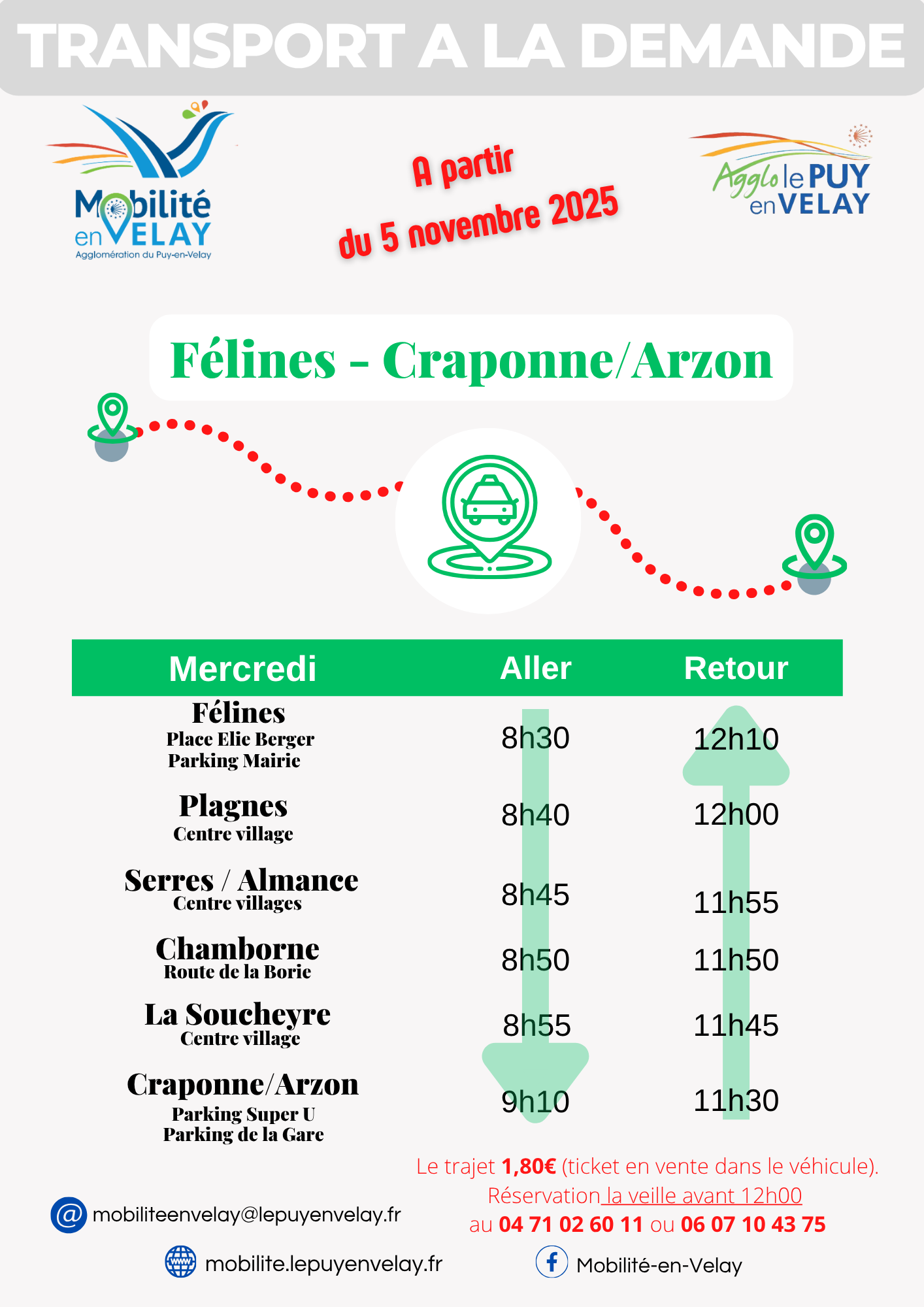 Contacter l’espace commercial MOBILITE-EN-VELAY la veille avant 12h00 pour réserver au 04 71 02 60 11